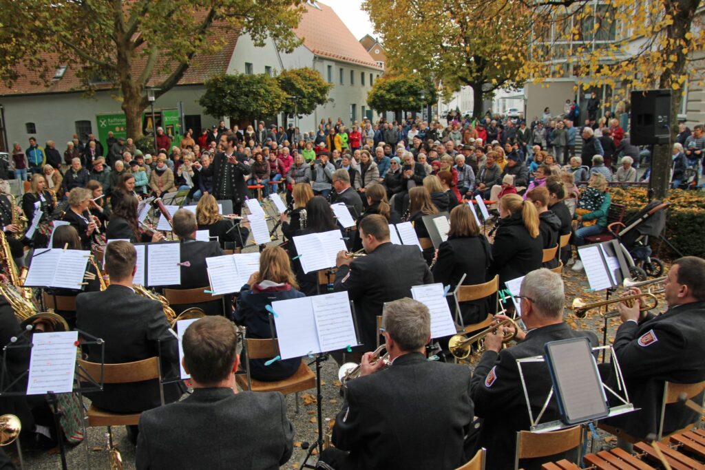 Vom Bürgerhaus Adler bis hinüber zum Reichshof war der Schrannenplatz so gut wie voll mit Publikum, als Dirigent David Schöpf die „Serenade“ der Stadtkapelle Illertissen am Nachmittag des Kirchweihsonntags eröffnete. Nach einer ebenso launigen wie bestens passenden Ansage, die allein schon für die ersten Lacher sorgte, gab Schöpf den Einsatz zur strahlenden Ouvertüre „Columbus“ und zwei Filmmusiken. Danach wechselten sich traditionelle Marsch- und Polkamelodien in bunter Folge ab, und zwischendurch gab es noch die besten Hits von Adele. Zum krönenden Abschluss verstärkte die Jugendkapelle das Orchester, und auch damit zeigte David Schöpf, dass Blasmusik Jung und Alt zusammenführt und dass nicht nur die Zuhörerschaft, sondern auch die Aktiven viel Spaß am Musizieren haben. Die Ankündigung, dass im kommenden Jahr wieder eine Serenade veranstaltet wird, wurde mit Begeisterung aufgenommen verstärkte nach einer Zugabe den verdienten Schlussapplaus.
