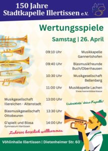 Am Samstag, den 26. April 2025 starten um 9:00 Uhr in der Vöhlinhalle Illertissen die Wertungsspiele. Wir freuen uns sehr auf eure Teilnahme und auf viele musikalische Highlights.